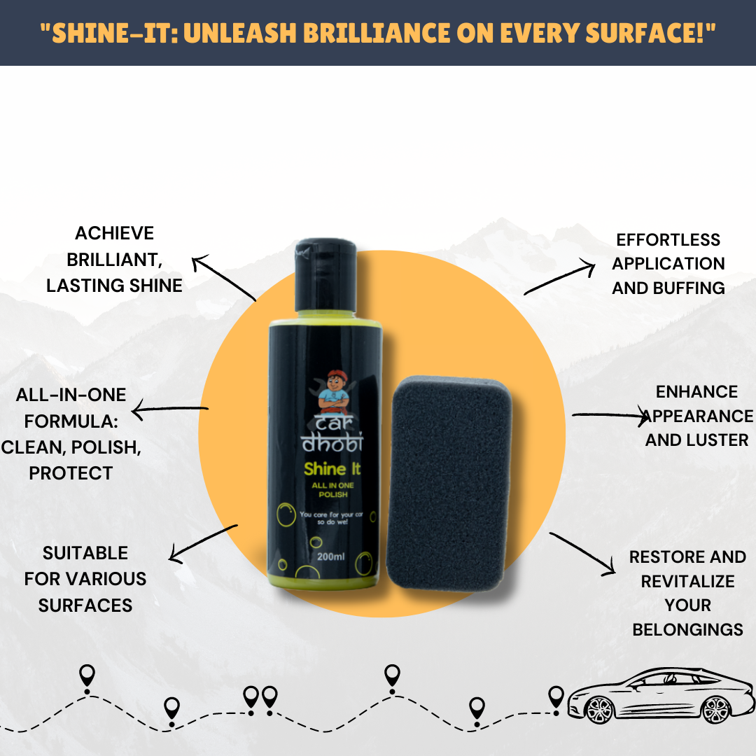 Elevate your vehicle's appeal with CAR DHOBI Shine It polish for cars . Embrace brilliance, protection, and quality that redefine your ride's appearance. Trust CAR DHOBI to bring back the showroom shine, ensuring your vehicle remains timeless and captivating.